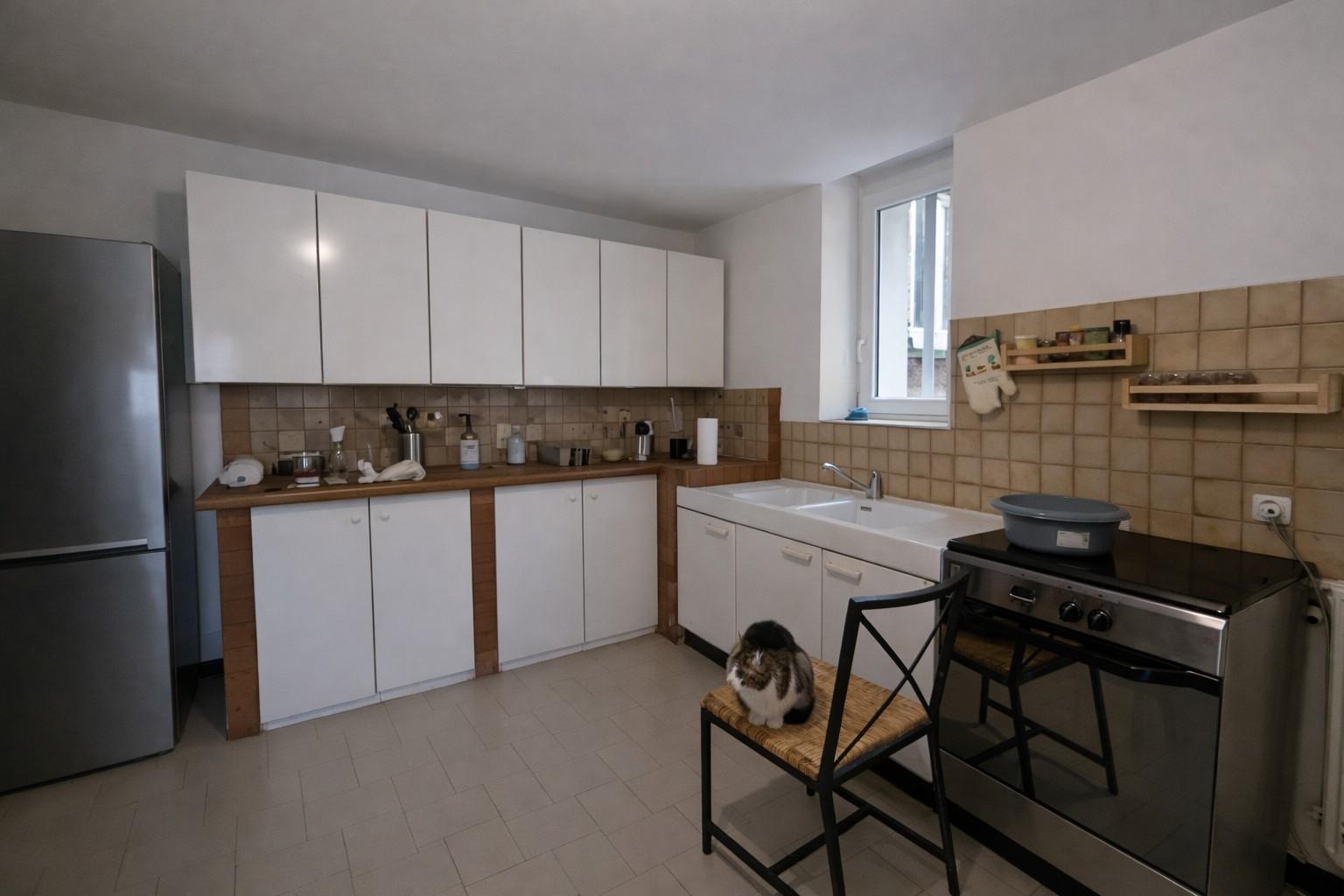 Le logement dispose au rez-de-chaussée d’une pièce à vivre ouvrant sur une cuisine spacieuse, avec un accès à un wc et un débarras.